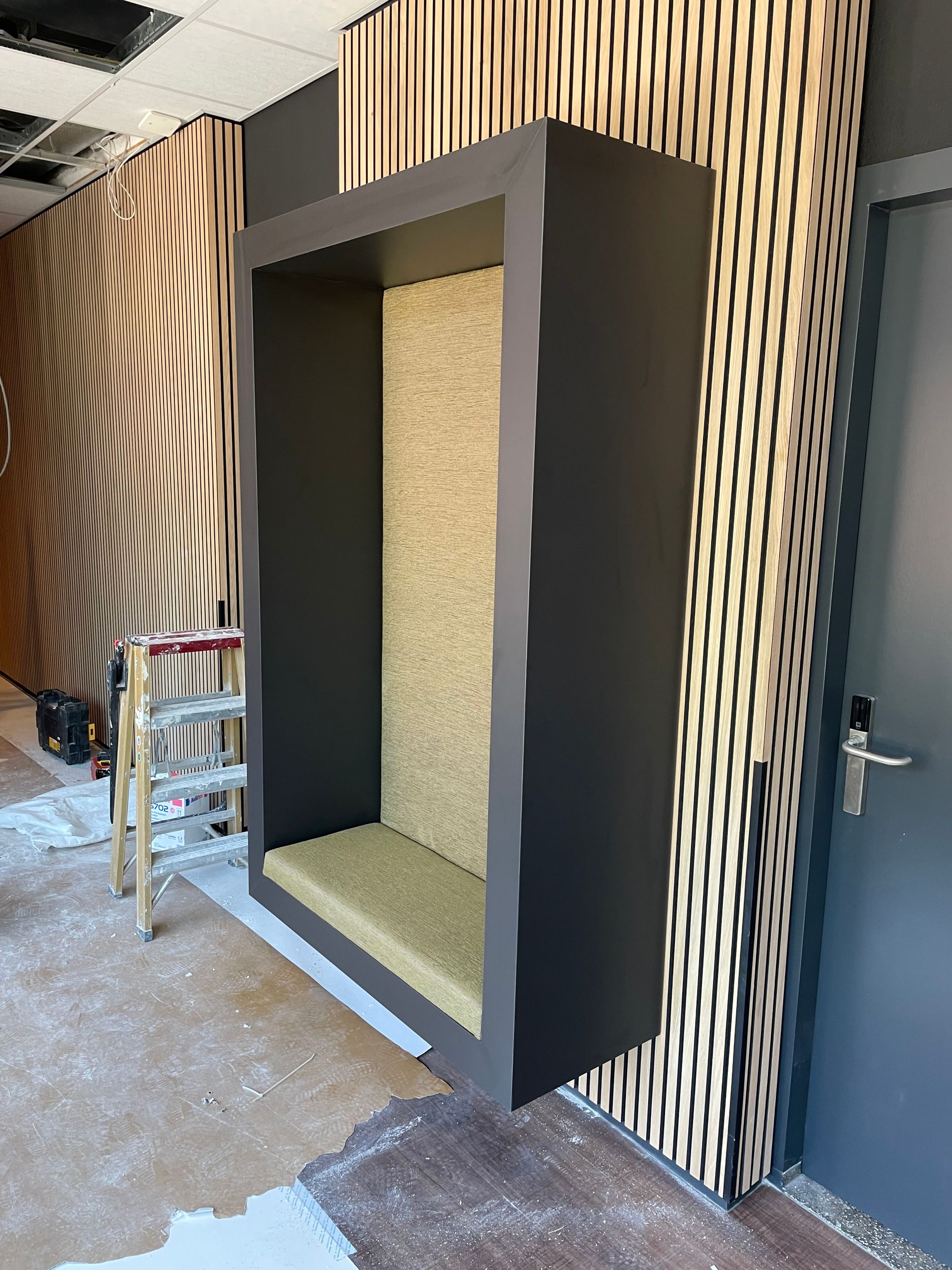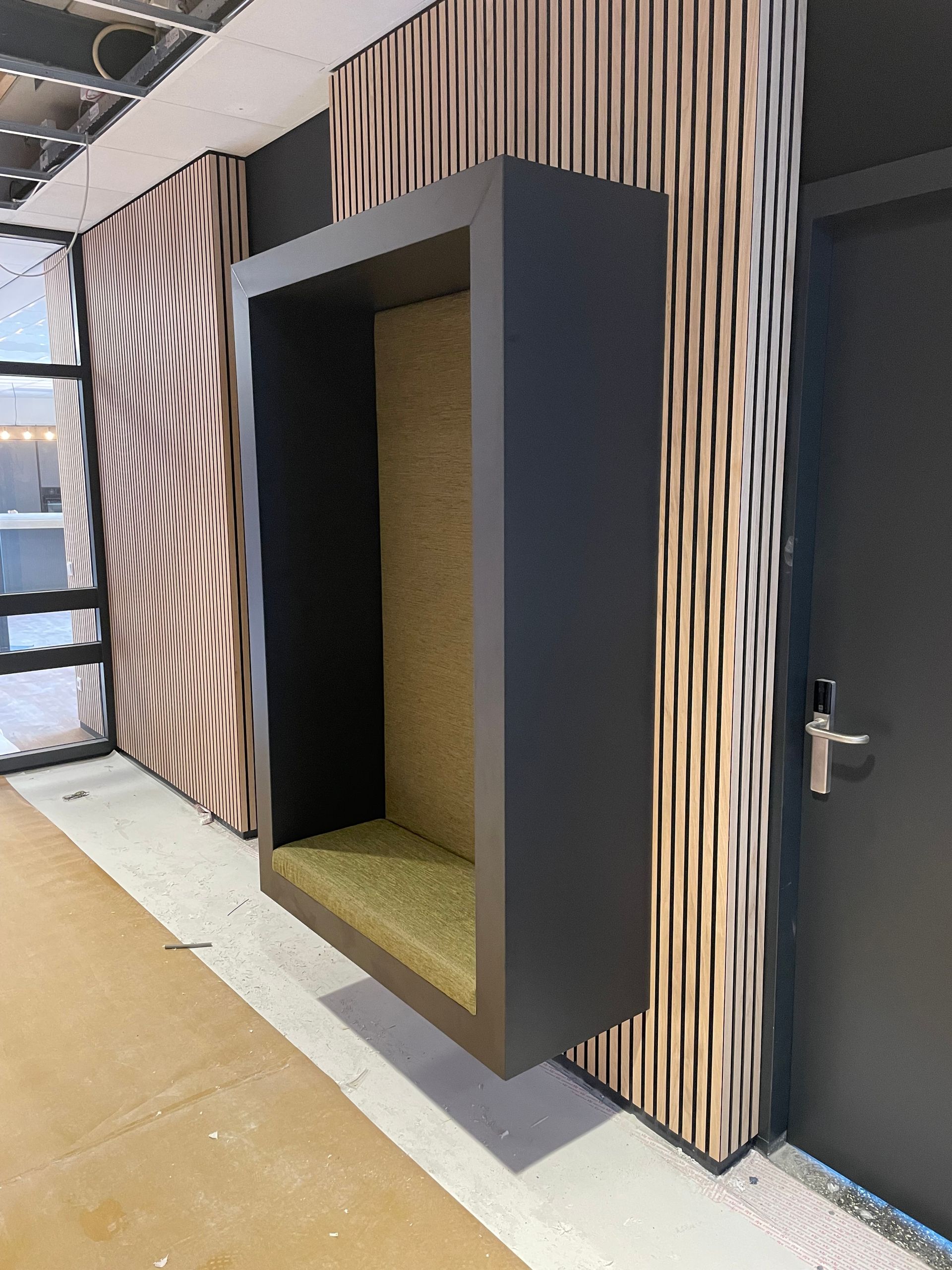 Voor deze opdrachtgever zijn er 2 hangende bankjes gemaakt. De bedoeling is dat werknemers hierin rustig een telefoontje kunnen plegen, zonder dat iedereen hier last van heeft. Zowel het zwarte frame als de kussens hebben wij mogen verzorgen.